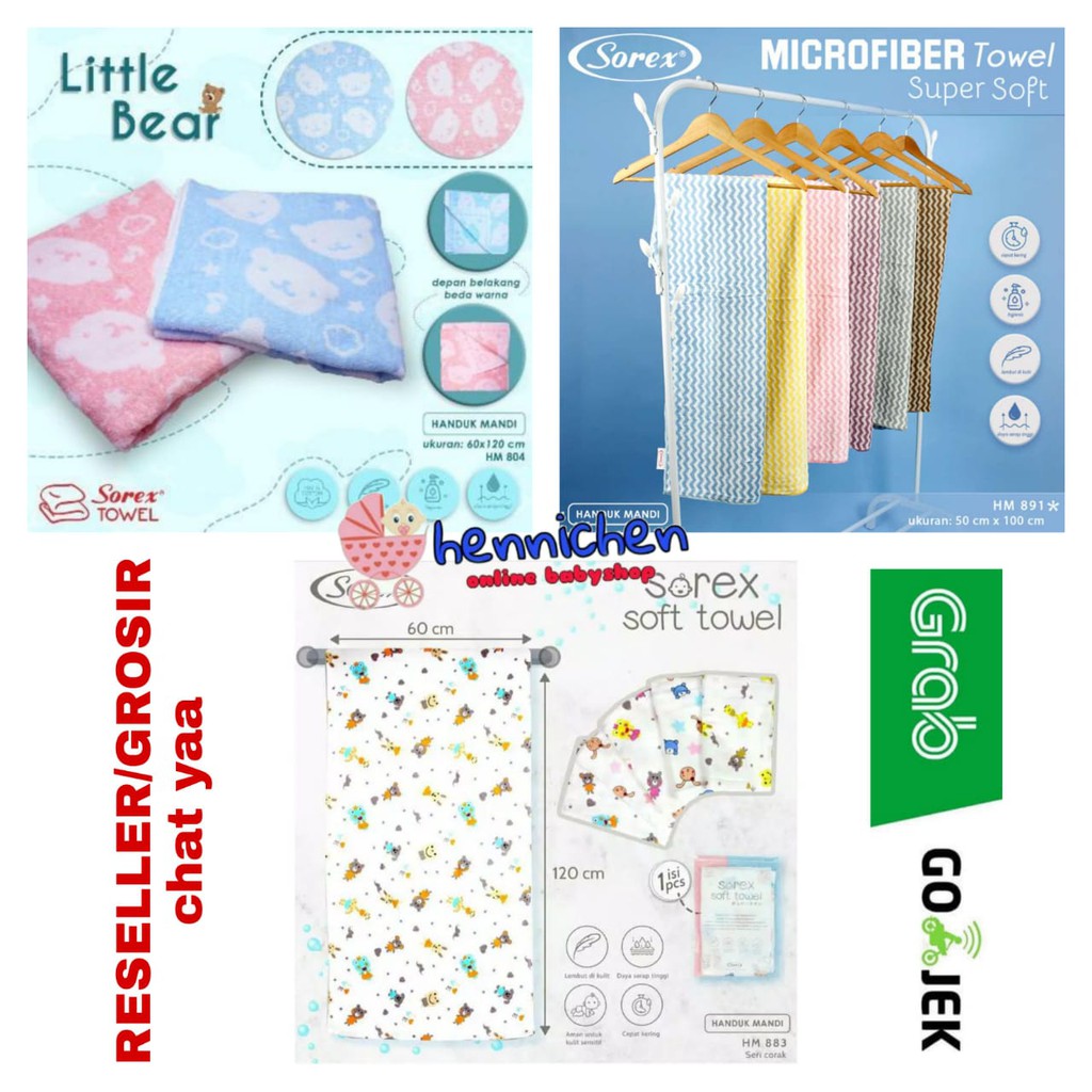 [Harga per 1pcs]Merk: SOREX TowelUkuran: 120 x 60 (cm) => lebih besar dari handuk Little TerryMotif: Sesuai di fotoWarna:Kode HM 804 Motif Little Bear (Dasar Warna)* Biru* PinkKode HM 883 Dasar Putih ada Motif => motif acak ya akan disesuaikan untuk boy atau girlDeskripsi Produk:* Terbuat dari 100% katun* Halus dan Lembut untuk kulit bayi* Cepat Menyerap Air* HIgienis* Ukuran 120x 60 (cm)* Bisa untuk handuk travelling dewasa karena tidak terlalu besar dan pas di gunakanHANDUK HM 891Bahan microfiber super lembut ukuran 50cm x10