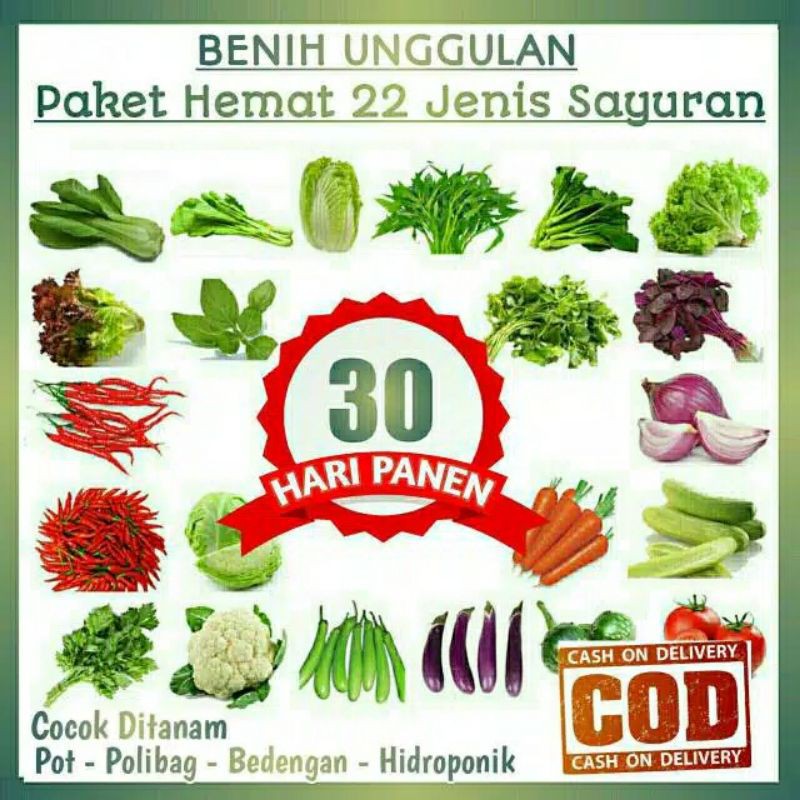 semua benih sayuran yang kami jual adalah benih unggulan F1 yang sudah terbukti mempunyai daya tumbuh antara 85-95% . jadi gak perlu khawatir ya kak, dengan harga terjangkau kakak sudah memiliki 22 jenis benih sayuran unggulan.mari kita mewujudkan kemandirian pangan dengan menanam sendiri sayuran dipekarangan rumah, kami menawarkan : PAKET BENIH SAYURAN MURAH*isi paket benih antara lain:1.PAKCHOY (ratusan biji)2.SAWI HIJAU (ratusan biji)3.SAWI PUTIH (10 biji)4.KANGKUNG (50 biji)5.KAILAN (10 biji)6.SELADA HIJAU (20 biji)7.SELADA MERAH (20 biji)8.KEMANGI (50 biji)9.BAWANG MERAH (20 biji)10.BAYAM HIJAU (ratusan biji)11.BAYAM MERAH (ratusan biji)12.KEMBANG KOL (10 biji)13.CABE KERITING (5 biji)14.CABE RAWIT (12 biji)15.TIMUN (5 biji)16.WORTEL (20 biji)17.KOL (10 biji)18.SELEDRI (ratusan biji)19.TERONG HIJAU (15 biji)20.TERONG UNGU (15 biji)21.TERONG LALAP BULAT (15 biji)22.TOMAT (6 biji)*) dilengkapi panduam penanaman.*) daftar benih bisa berubah setiap saat sesui stock.*)dapat ditanam dipot,polybag,bedengan,dan sistem hidrop