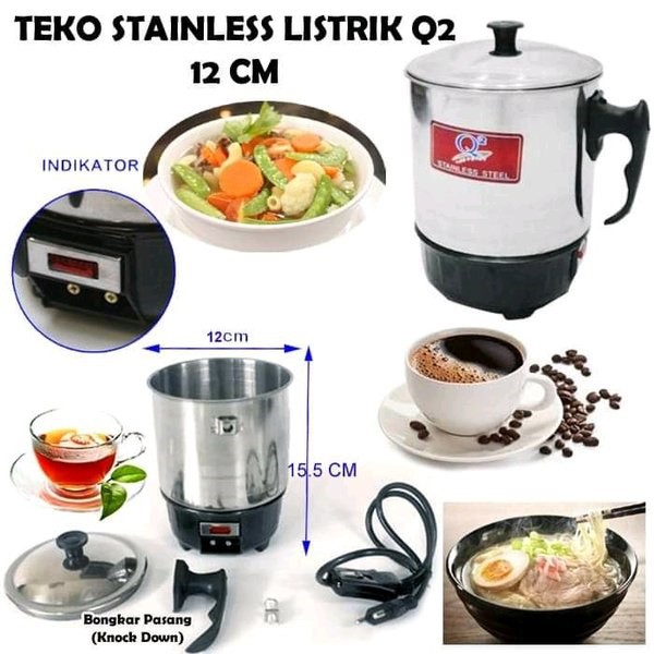 Mug elektrik Q2-8011 Dengan Diameter 12 CM Mug Elektrik Q2 ini dapat memudahkan pekerjaan dapur Tidak perlu membeli dispenser yang mahal, anda cukup membeli MUg elektrik dari Q2 untuk dapat memanaskan air dengan sangat mudah cara penggunaan yang cukup mudah, cukup dengan menyambungkan ke listrik lalu nyalakan tombol merah pada mug Q2, maka air anda akan segera hangat atau panas Dilengkapi dengan tutup, sehingga mencegah air untuk tumpah dan menjaga kebersihan dari kotoran, lalat, atau serangga lainnya Dilengkapi dengan kabel yang tebal sehingga tidak mudah patah Spesifikasi:- Diameter: 12 CM- Tinggi: 10 CM - Kapasitas: 1200 ML (0.95 L)- Daya: 190 Watt - Voltase: 220 V 50 Hz- Material: Stainless S