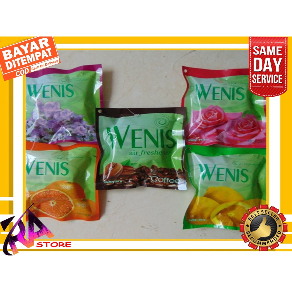 WENIS AIR FRESHNER / PENGHARUM RUANGAN / MOBIL ORIGINAL 50 GRAM Merek daftar : IDM000186671 Kemenkes RI PKD 20601510655 TERSEDIA 4 VARIAN * Lavender READY * COFFE READY * Orange READY * Lemon READY WENIS AIR REFRESHNER Dengan kemasan yang praktis dan ekonomis, serta menggunakan parfum yang bermutu tinggi, mampu menciptakan suasana nyaman dengan keharuman yang tahan lama. Dapat digunakan di mobil, ruangan, lemari, toilet dan lain lain. CARA PAKAI * Gunting kantong sesuai petunjuk * Gantungkan ditempat yang diinginkan, terutama ditempat yang mempunyai aliran udara PERHATIAN * Jangan dimakan, jika tertelan hubungi dokter/rumah sakit terdekat. * Jauhkan dari jangkauan anak anak dan sinar matahari langsu