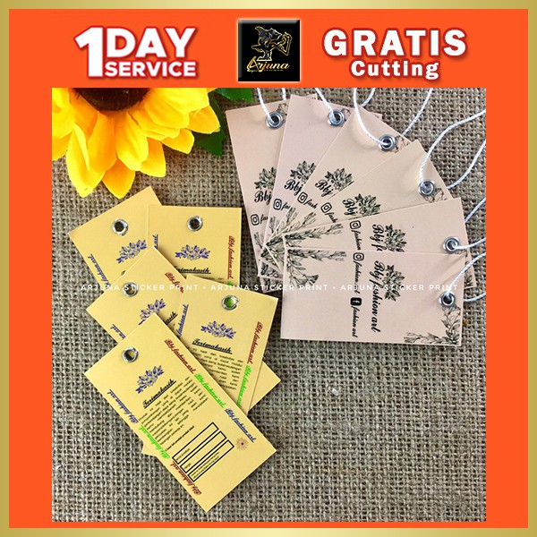 PASTI NYAMAN, PASTI AMAN bersama Arjuna Sticker Print- GARANSI ganti barang / GARANSI uang kembali 100% apabila Kakak tidak puas dengan hasil kerja kami- Hasil print TAJAM dan cutting PRESISI- Proses pengerjaan & pengiriman CEPAT100 PCS HANG TAG BAJU/ PRICE TAG/ LABEL HARGA/ LABEL MEREK JILBAB*minimal order 100pcs*spesifikasi produk hang tag- cetak 1 sisi (digital printing)- free lubang (5mm) dan potong kotak- pengerjaan 5-7 hari- bahan art paper 260gram.*HANYA MENERIMA DESIGN JADI*.yukk langsung checkout aja disinii....mau lebih awet tahan air?bisa di tambahkan jg paket laminasi, ada 2 pilihan plastik yg tersedia..ada glossy (mengkilap) ada jg doff (matte)#ha