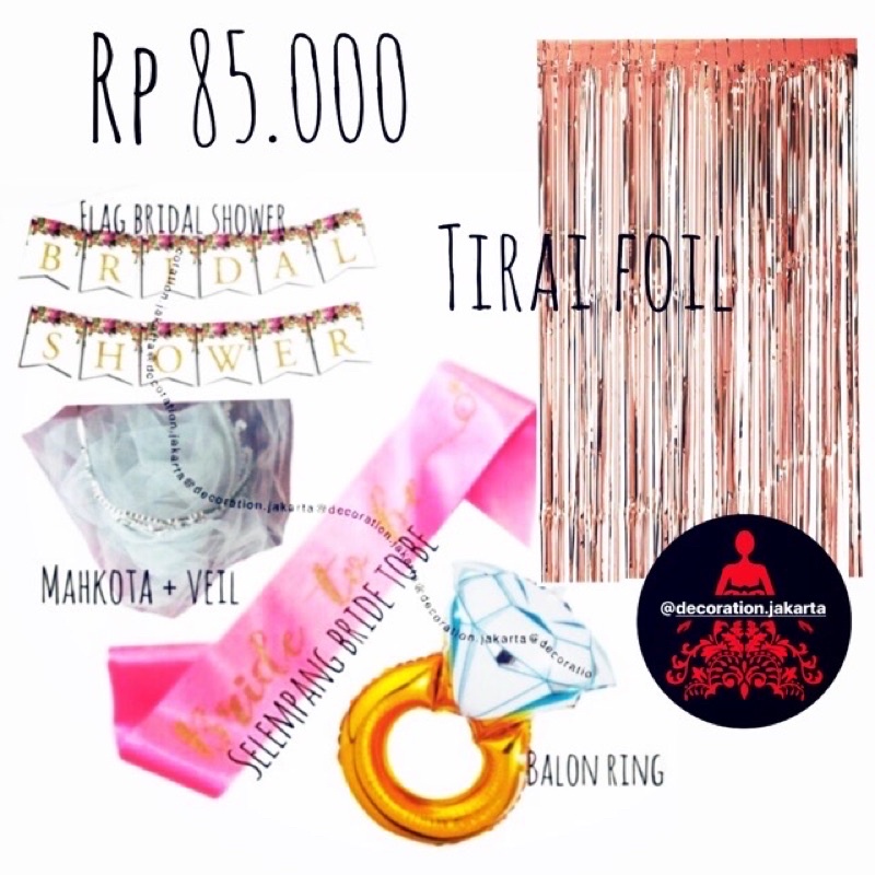 Package include :-MAHKOTA VEIL-SELEMPANG BRIDE TO BE. Warna Pink atau Putih disesuaikan dengan stok yg ada-FLAG BRIDAL SHOWER-BALON RING MINI-TIRAI FOIL PINk / ROS