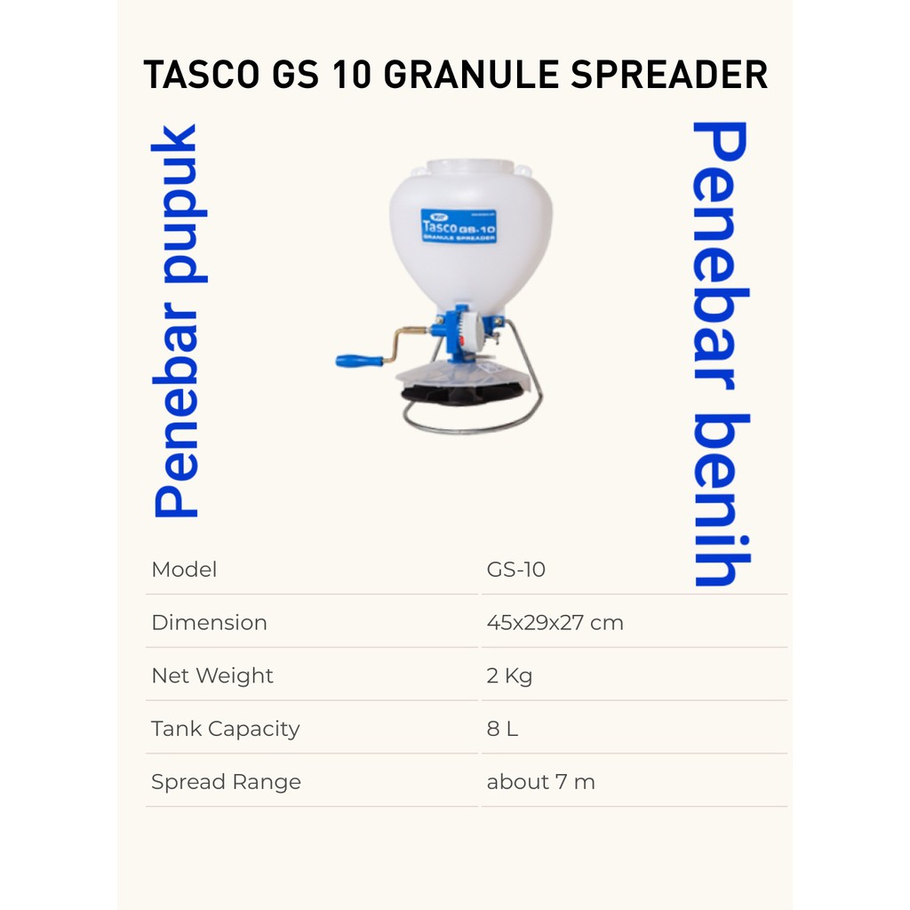 Mesin Alat Penebar Benih / Pupuk TASCO GS 10 Granule SpreaderDeskripsi Mesin Alat Penebar Benih / Pupuk TASCO GS 10 Granule SpreaderBerikan Tanaman Anda Nutrisi terbaik dengan penyebaran pupuk yang merata!Tasco GS-10 Granule Spreader berfungsi menebar benih dan pupuk hingga jarak sekitar 7 m! Jangkauan luas, kapasitas tangki 8 L serta berat bersih 2 Kg.Spesifikasi:Dimension 45x29x27 cmNet Weight 2 KgTank Capacity 8 LSpread Range abou