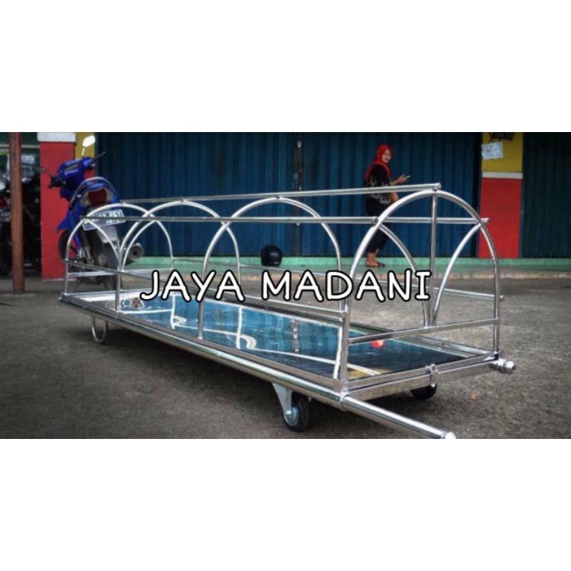 Keranda Mayat dibuat dengan menggunakan bahan Stainless Steel sehingga kuat dan ringan, sera tidak akan berkarat meski ditempatkan ditempat yang lembab dalam waktu yang lama Gratis Kain Keranda Ongkir Dibicarakan Dengan Seller kain keranda Bagian depan dan belakang keranda mayat ini dilengkapi dengan pengunci kurungan, agar kurungan tidak lepas saaat mengantar jenazah terutama dalam jarak yang cukup jauh, Kurungan keranda mayat ini dilengkapi dengan aksesoris pipa 0,5 inch, selain untuk memberikan kesan yang aristik pada keranda, aksesoris ini juga berfungsi sebagai penanda penempatan kepala dan kaki pada jenazah, dibagian bawah keranda terdapat pcs roda mati 4 inch dibagian depan, berfungsi untuk memudahkan kita saat memasukan keranda mayat ke dalam mobil ambulance ataupun saat akan di simpan cukup dengan satu orang untuk mengangkat dan mendorong keranda. Dibagian bawah posisi belakang keranda terdapat pipa 1 inch, dengan panjang 12,5 cm, untuk kaki dan ditutupi sepatu karet pada ujungnya. selain bahan keranda yang ringan, kuat dan tidak mudah berkarat keranda stainless ini juga mudah dibersihkan, jika kondisi keranda sudah kotor dan lengkep cukup di cuci dengan air dan lap dan lebih bagusnya lagi dengan menggunakan sabun Spesifikasi : Bahan: Staniless Steel Dimensi: Panjang 200 cm – Lebar 65 cm – Tinggi kurungan 45 cm Beban Maximum Lingkaran pipa 5/8 inch tebal 0,8 / 1,0 mm, panjang 120 cm Palang penghubung pipa 5/8 inch tebal 0,8 / 1,0 mm, panjang 196,5 cm + tutup dop Frame hollow 15 x 15 x 1,0, panjang 58,5 cm Aksesoris pipa 0,5 inch, panjang 35 cm Plat SS 201, tebal 1,0mm, panjang 195 cm, lebar 57 cm Kunci cover ( pengunci kurungan dan gotongan ) pipa 1,5 inch tebal 1,0 mm untuk frem kiri & kanan Plat siku (besi) tinggi 2,5 cm pipa 1,25 inch untuk tarikan, panjang 50 cm Dudukan bola untuk penutup tarikan roda karet mati 4 inch untuk kaki depan Hollow 20 x 20, panjang 57 cm pipa 1 inch, panjang 12,5 cm, untuk kaki belakang Hollow 15 x 30, panjang