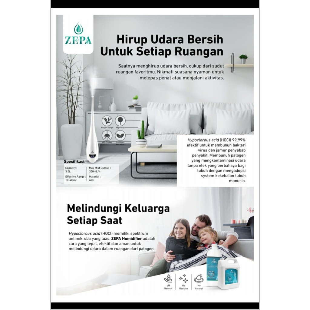 ZEPA HOCL HUMIDI1. Non Alcohol, berbahan HOCL (Hypochlorous Acid) 200 ppm (0,020%) pH 6,1, mampu membunuh virus hinga 99,99% dalam 15 detik.2. SANGAT AMAN3. Telah tersertifikasi 100% Halal oleh MUI4. Memiliki izin edar dari Kementerian KesehatanPERHATIAN :1. Simpan di tempat sejuk (25 - 39 derajat celcius) dan kering2. Hindari paparan langsung sinar matahari3. Tidak untuk dicampur dengan alkohol atau bahan kimia lain4. Tutup kemasan dengan rapat setelah digu